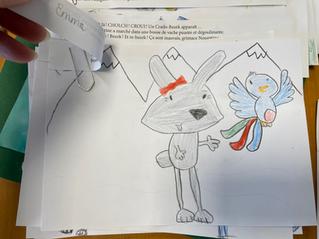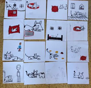Puis les élèves vont être les illustrateurs et illustratrices: je lis une histoire aux élèves, adaptée à leur âge, je leur donne ensuite à chacun une partie de l'histoire qu'ils vont illustrer. Je dessine au tableau les personnages, les expressions, les objets utiles à l'histoire, puis les élèves vont à leur place et commencent leurs dessins. Je circule dans la classe et aide les enfants si besoin. Une fois les dessins au crayon validés ils les mettent en couleurs.